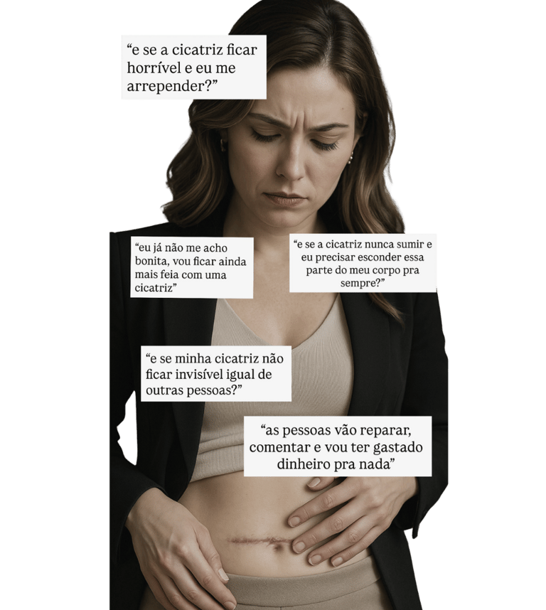 A verdade é que uma cicatriz feia interfere diretamente na sua autoestima, felicidade e satisfação com seu corpo... é uma marca que ficará ali PRA SEMPRE.